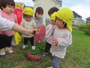 3歳児・4歳児・5歳児の子ども達が力を合わせて掘り、大きなお芋がとれると「みて!大きいよ」と嬉しそう!